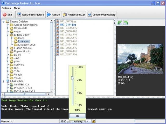 The "Fast Image Resizer for Java Tool" has following features: resize all JPEG/JPG images of a directory, generate web galleries, store resized images in a ZIP file, add text or image watermark. The Tool is available in German and English.