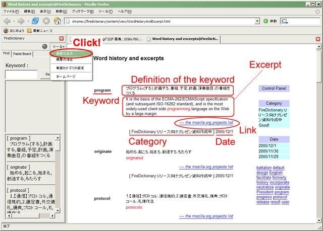FireDictionary is a Firefox extension which provides a simple and powerful dictionary function. By moving the mouse cursor, a translation appears on the sidebar. FireDictionary finds the translation as a real-time operation when you move the mouse cursor