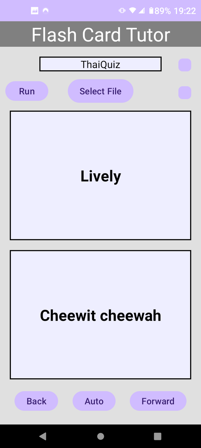 This Android application is intended to work like "flash cards" that have an quiz question on one side and the answer on the flip side. It has 2 displays boxes: An upper box in which a "quiz" line is displayed, and a lower box in which an Answer is displayed. In its simplest form, the user touches the upper box to see the next randomly chosen Quiz line. If he doesn't know the answer, he can touch the lower box to see the Answer.