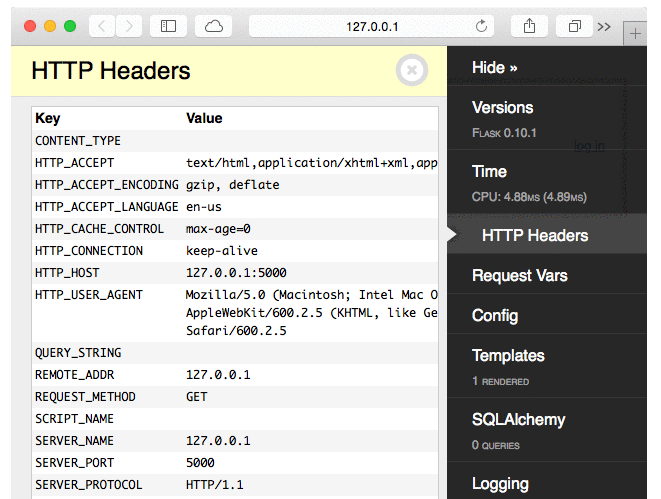 - The toolbar will automatically be injected into Jinja templates when debug mode is on