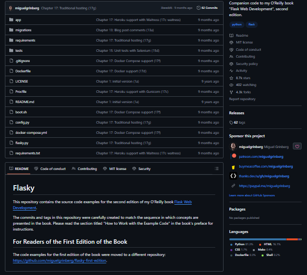 Flasky is a comprehensive example web application built with the Flask microframework that demonstrates best practices for developing real-world Python web applications, covering everything from project structure and configuration to database models, authentication, and deployment. It serves as both a tutorial and sample codebase that walks developers through building a full-featured web application, including user registration and login, role-based permissions, user profiles, and content creation. The project shows how to organize a Flask application into reusable blueprints, configure environment-specific settings, integrate SQL databases via SQLAlchemy, and manage migrations. Beyond the core web functionality, Flasky illustrates testing strategies using Python’s unittest framework, including tests for models, views, and authentication flows to promote test-driven development.