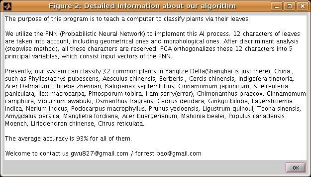 The purpose of this program is to teach a computer to classify plants via their leaves. You just need to input the image of a leaf(acquired from scanner or camera), then the computer can tell you what kind of plant it is.
