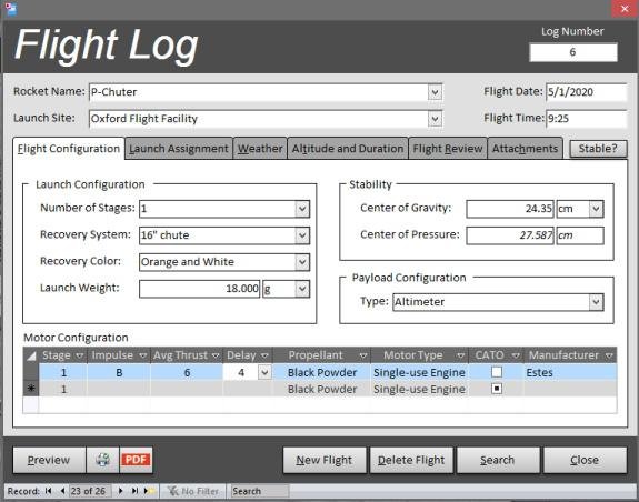 Flight Logs is more than just a database to log your rocket flights. Flight Logs is an in-depth record of your rocket activities. It records your flights plus collects data on events surrounding your flights, and allows you to track how well the rocket performed.