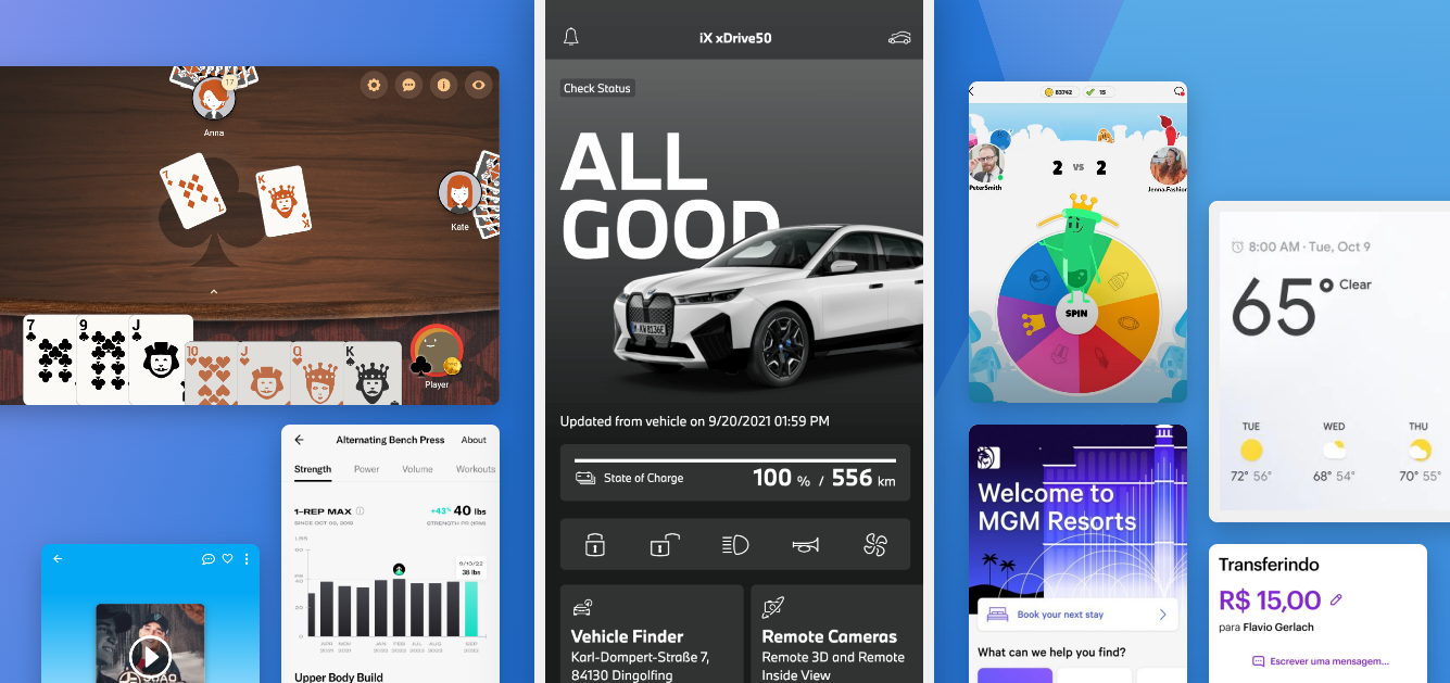 - Uses Dart with its own rendering engine for high frame-rate and customizable UI (“widget” system)