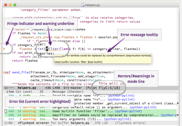 Flycheck is a modern on-the-fly syntax-checking extension for GNU Emacs, intended as replacement for the older Flymake extension which is part of GNU Emacs. For a detailed comparison to Flymake see Flycheck versus Flymake. It uses various syntax checking and linting tools to automatically check the contents of buffers while you type, and reports warnings and errors directly in the buffer, or in an optional error list. Out of the box Flycheck supports over 40 different programming languages with more than 80 different syntax-checking tools, and comes with a simple interface to define new syntax checkers. Many 3rd party extensions provide new syntax checkers and other features like alternative error displays or mode line indicators. Flycheck needs GNU Emacs 24.3+, and works best on Unix systems. Windows users, please be aware that Flycheck does not support Windows officially, although it should mostly work fine on Windows.