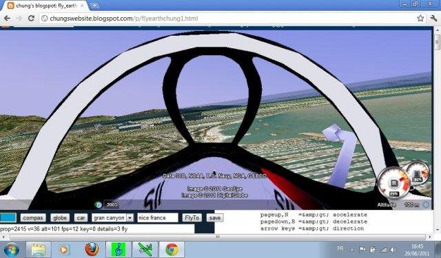 fly earth chung is a free 3D flight / car / shoot simulator using google earth geplugin, javascript and freebasic. Explore the world in plane,car or feet. Include a freebasic exe application for sound/joystick interface and web launcher.