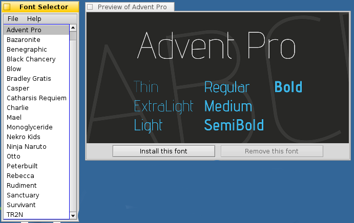 No, it's the fancy font for a poster or a flyer that concerns me here. Typically you use those once, and then they just take up space on the HD and clutter up the Fonts menu of your text editor. FontMonkey is a specialized package manager just for those fonts. Pick a font, install it and when you are done, remove it again, all via the Haiku package management setup. Obviously it has a preview facility. The initial release supports thirty fonts from my repo. As I make new font packages (and there are a lot of those lined up!), I will add them to FontMonkey.