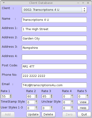 Allows for multiple transcription clients, database export for spreadsheet invoicing.