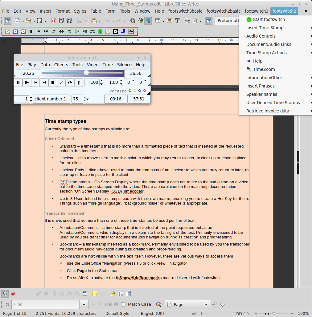 Footswitch 3 is a media player for transcribers on Linux. Written in python using the python bindings for Gstreamer it allows a transcriber to control the audio or video with a foot pedal, and includes a set of macros that integrate into LibreOffice. This allows the transcriber to control the media player from within Libreoffice as well, making it useful for those who do not yet own a foot pedal/foot switch.