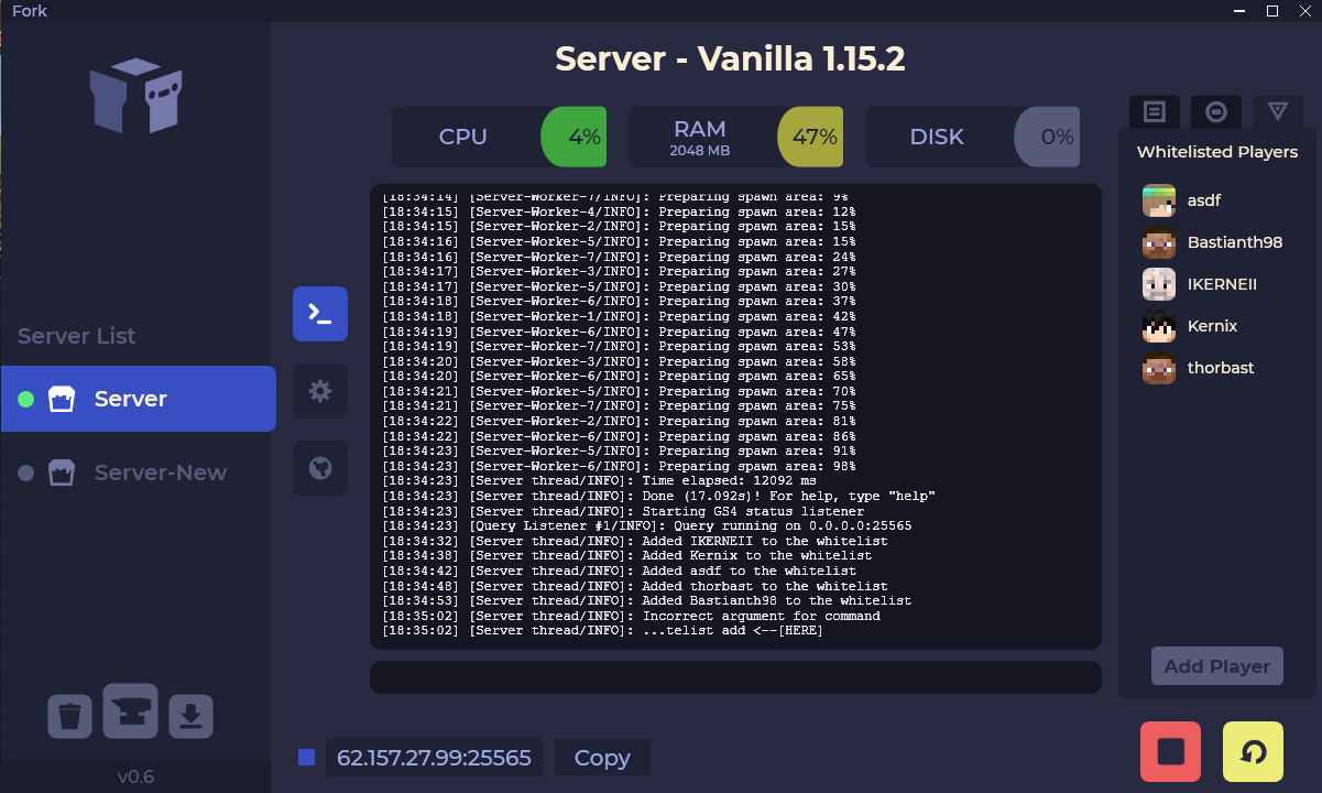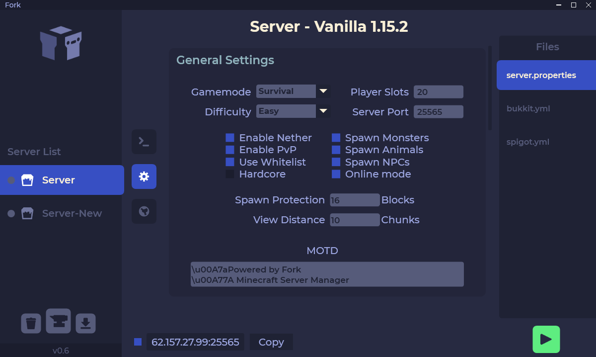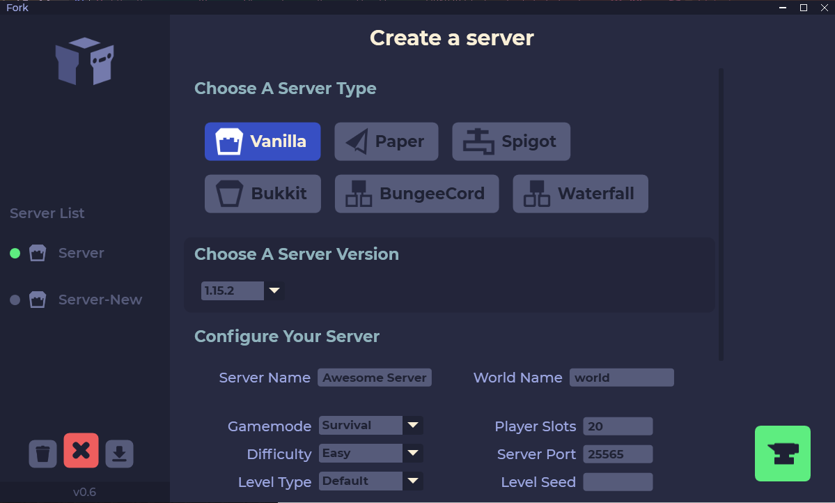 Fork is a free Minecraft server manager GUI designed to make server hosting easy and fast. Features allow automatic server restarts and backups, hardware statistics like CPU usage, player management and much more...