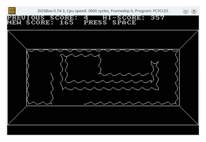 This is simple Light Cycles imitation written in Forth. Comparing to original game, the carts are moving in waves rather than straight lines. It should compile with DXForth and xplgraph library on DOS and CP/ M systems. For CP/M version of xplgraph library look for my other project: https://sourceforge.net/projects/xplgraph-cpmgsx-dxforth