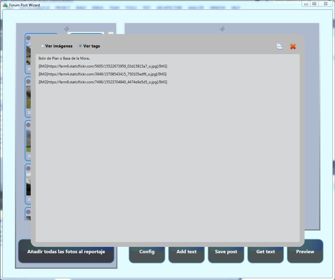 Una vez hayas finalizado de editar tu reportaje, podrás obtener el contenido del mismo, con las URLs de las fotos correctamente etiquetadass. Sólo tendrás que copiar y pegar este texto en el foro de internet donde quieras publicar el reportaje.