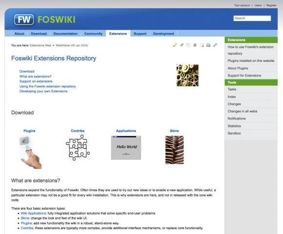 Foswiki is an Enterprise wiki, typically used to run a collaboration platform, knowledge base or document management system. Users can create wiki applications using the Topic Markup Language, and developers can extend its functionality with plugins.