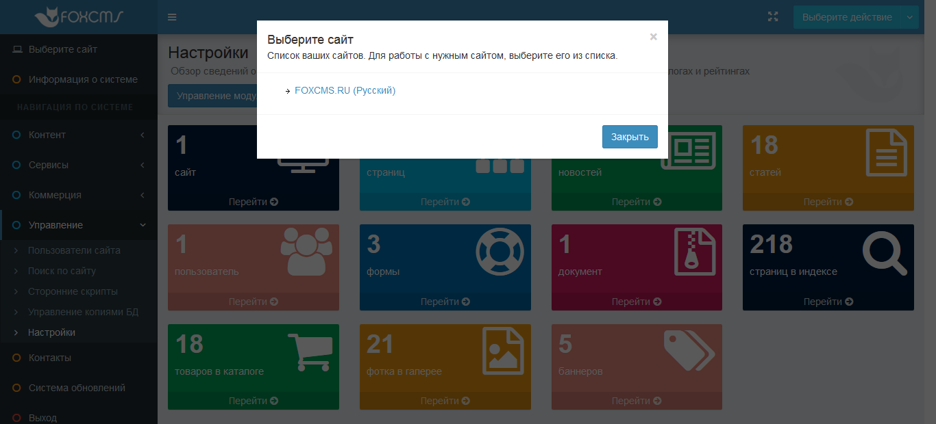 На базе одной копии FOX.CMS можно создать неограниченное количество сайтов и управлять ими из единой Панели управления.