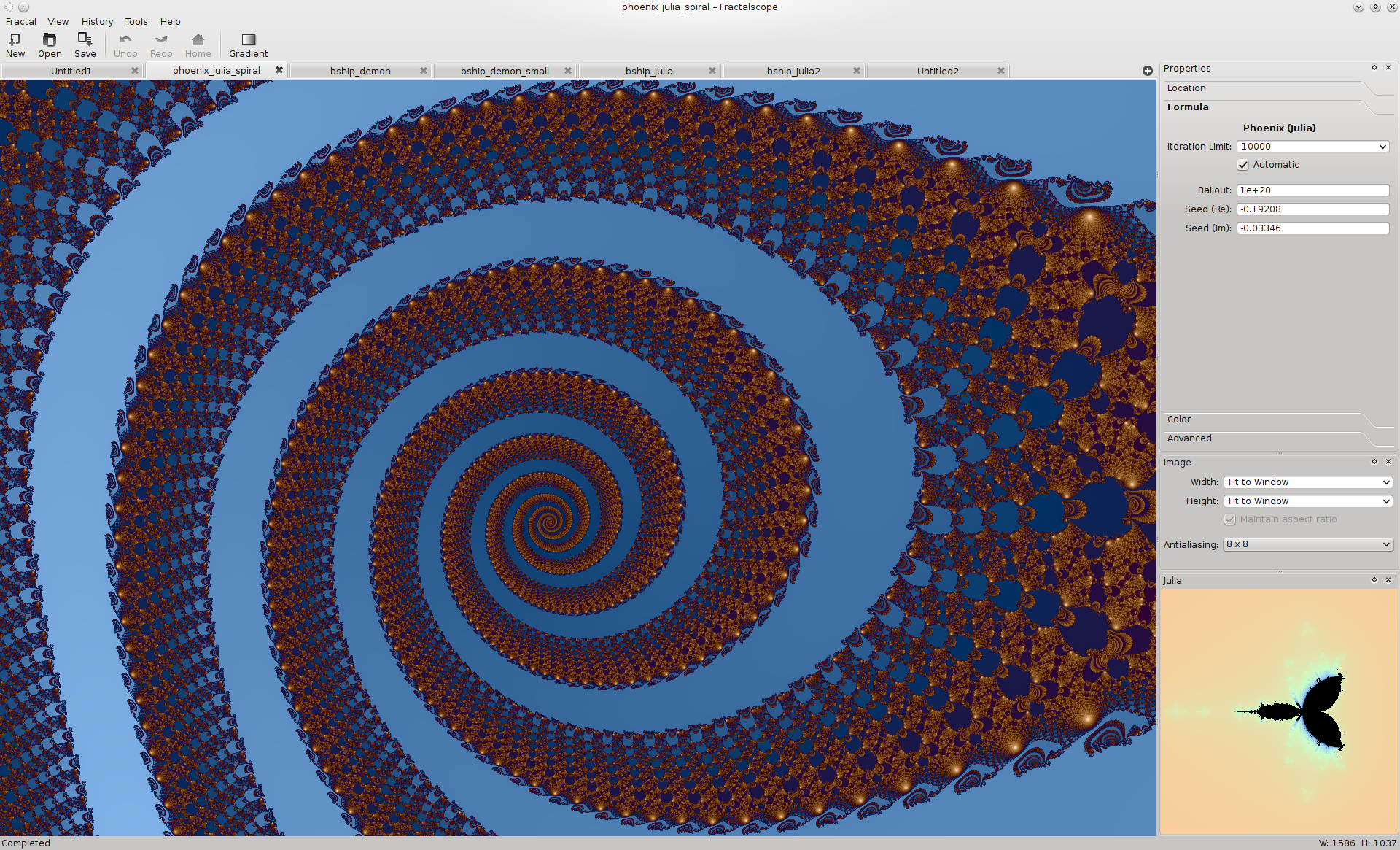A tabbed document interface, cross-platform fractal explorer written in Qt. Emphasis is on ease of use and a fluid, non-blocking interface. Features include animated zooming and panning, arbitrary precision, and antialiasing.