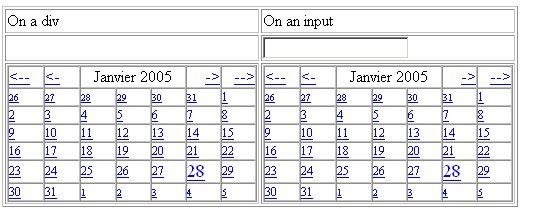 A free javascript date picker. You can open a calendar and click on a date to paste it on a field. You can have infinite calendar in the same web page.