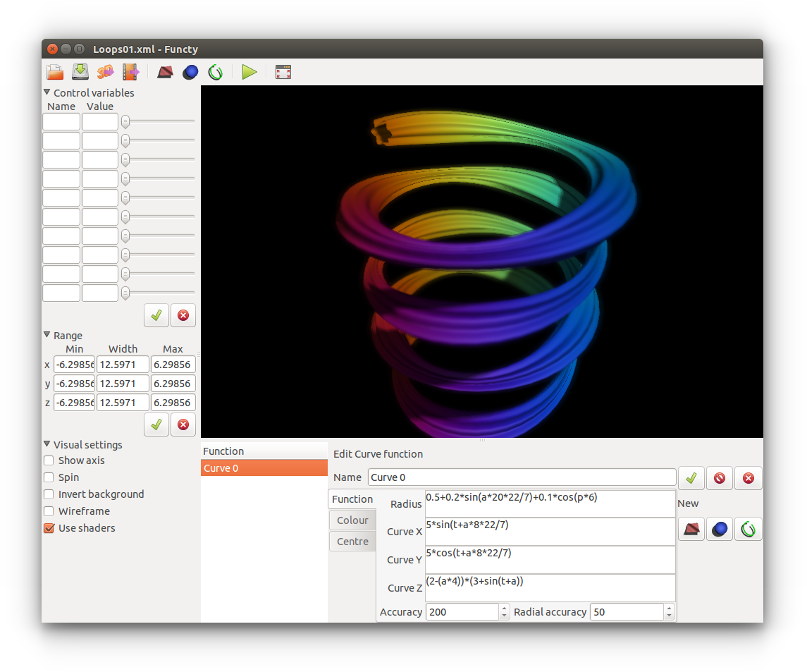 Functy is a 3D graph drawing package. It allows Cartesian, spherical and parametric curve functions to be plotted and altered quickly and easily. This immediacy and the vivid results promote fun exploration of 3D function.