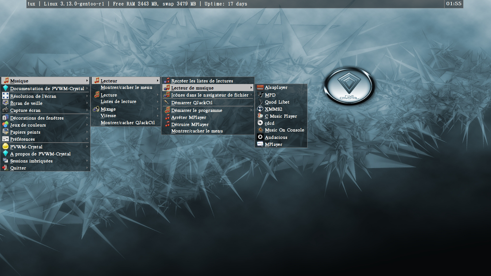 FVWM - Crystal aims to create an easy to use, eye-candy but also powerful desktop environment for Linux or other Unix-like operating systems. Its goals include seeking for better ways of using window manager and providing it with eyecandy interface.