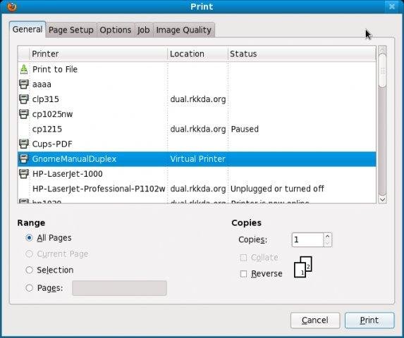 gnome-manual-duplex is a utility that adds manual duplex to the "Print" menu. It is a CUPS Virtual Printer as well as a standalone utility. It works with *.ps and *.pdf files.