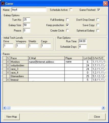 A windows program to control the e-mail and turn processing of the windows version of the Play by E-Mail GalaxyNG space war game. This program assists GalaxyNG Games Masters to design games, accept registrations and orders and process turns on schedule.