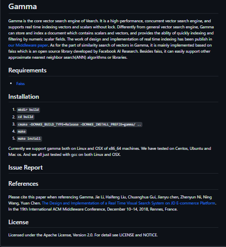 Gamma is the core vector search engine of Vearch. It is a high-performance, concurrent vector search engine, and supports real-time indexing vectors and scalars without lock. Differently from the general vector search engine, Gamma can store and index a document containing scalars and vectors, providing the ability to quickly index and provides the ability of quickly indexing and filter by numeric scalar fields. The work of design and implementation of real-time indexing has been published in our Middleware paper. As for the part of similarity search of vectors in Gamma, it is mainly implemented based on faiss which is an open-source library developed by Facebook AI Research. Besides faiss, it can easily support other approximate nearest neighbor search(ANN) algorithms or libraries.