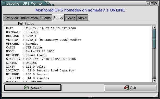 gapcmon is a gtk/glib desktop monitor program for the apcupsd package. apcupsd interfaces with UPS power systems on local or networked systems. gapcmon connects to apcupsd via the NIS api to collect and displays the current operational state of the U