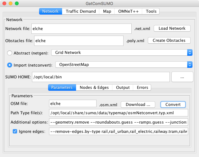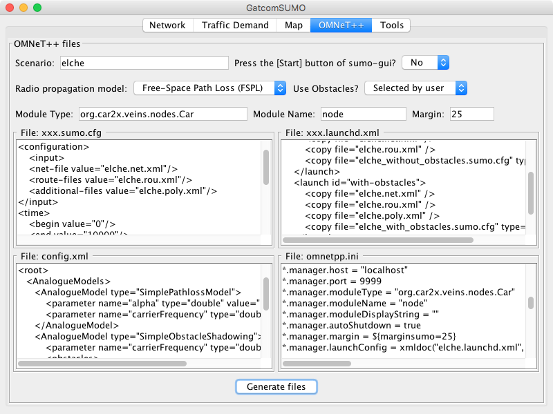 GatcomSUMO visualizes the network and routes easily, and they are created in such a way to meet the requirements of the involved simulators, in particular OMNeT++, in order to avoid misunderstandings and runtime errors. The application allows the conversion of the spatial coordinates used by SUMO into those used by OMNeT++, which is essential to place fixed elements like RSUs.