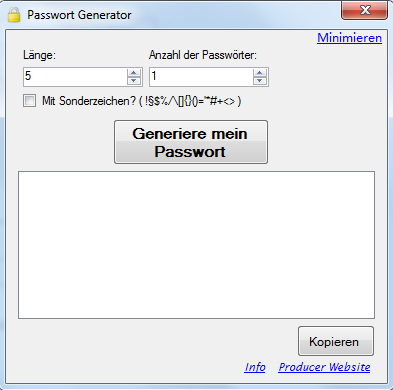 This is a Program for generating a save and strong pasword. You can choose the lenght of the password and how many you wont to create. Additional you can copy them to your clipboard.