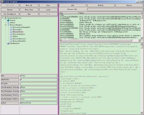 A toolkit for crawling information from web pages by combining different kinds of "actions". Actions are simple operations such as navigation to a specified url or extraction of text from the html. Also available is a graphic user interface.