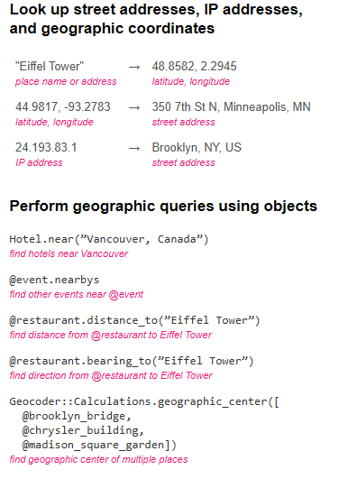 Geocoder is a full-featured geocoding library for Ruby that integrates seamlessly with Rails applications. It enables converting addresses into geographic coordinates (latitude and longitude) and vice versa, known as reverse geocoding. The gem supports multiple geocoding services like Google, Bing, Mapbox, and OpenStreetMap, letting developers choose based on cost or coverage. Beyond simple geocoding, Geocoder can perform IP address lookups, distance queries, and proximity searches directly in ActiveRecord or Mongoid models. With its database integration, you can query for nearby records, order results by distance, or filter results within a radius, making it invaluable for location-based apps. By abstracting away API differences and providing a clean Ruby interface, Geocoder makes geospatial features straightforward to implement in web and mobile projects.