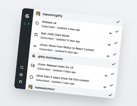 Your GitHub notifications on your menu bar. All your GitHub notifications on your desktop. Nice & Easy. Ever got lost with GitHub notifications? Too many emails? Gitify is all about making your life easier. Sitting on your menu bar, it informs you for any GitHub notifications without being annoying and of course without adverts. It just gets the job done. Works with GitHub and GitHub Enterprise. You can even connect multiple accounts. Gitify will notify you every time you receive a notification by playing a sound (not an annoying one - it's a promise), showing native mac OS notifications or by just turning its tray icon to green. It is not there to interrupt your workflow or distract you, you can customize your settings to your preference. Gitify is based on Electron, React, Tailwind CSS and more awesome open source libraries. Written in Typescript.