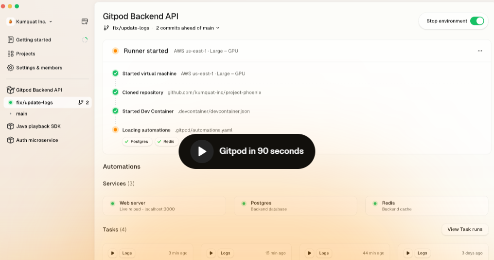 Gitpod’s developer platform provides on-demand, pre-configured environments that automatically integrate into any tool, library, or dependency required for creating software. Gitpod workspaces are the fastest and most secure way to ship software and are as easy as adding a .gitpod.yml file to the root of any repository.