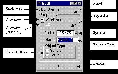 GLUI is a GLUT-based C++ user interface library which provides controls such as buttons, checkboxes, radio buttons, and spinners to OpenGL applications. It is window-system independent, using GLUT or FreeGLUT.