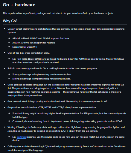 Go + hardware is a curated directory of libraries, tools, and tutorials that help developers use the Go programming language in hardware and embedded systems projects. Rather than being a single runtime library, the repository serves as a knowledge hub that aggregates resources for interacting with sensors, boards, and low-level devices using Go. It highlights Go’s cross-compilation capabilities and concurrency primitives, which are advantageous when building networked devices or controllers. The project is especially valuable for engineers exploring Go in IoT, robotics, or single-board computer environments. By organizing ecosystem resources in one place, it lowers the barrier to entry for hardware experimentation with Go. Overall, go-hardware functions as both a roadmap and reference point for developers bridging software and physical computing.