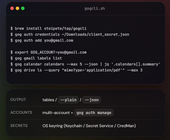 gogcli is a command-line interface tool that provides developers and power users with direct terminal access to a wide range of Google services without needing to leave the shell. This CLI tool covers several Google Workspace APIs including Gmail for email management, Google Calendar for scheduling and events, Google Drive for file operations, and Google Contacts for personal and corporate contact management. gogcli makes it possible to script repetitive tasks, automate workflows, and fetch or modify data from Google services in environments where GUI access isn’t practical. It’s particularly useful for developers who want to build integrations, handle bulk operations, or build tooling that interacts with Google APIs in CI/CD pipelines or automation scripts.