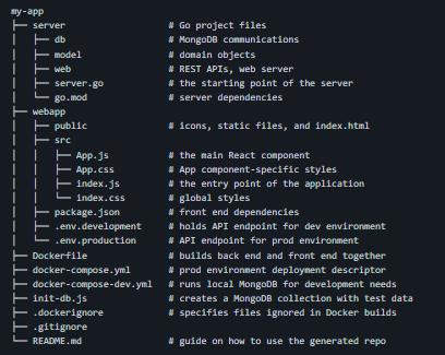 Goxygen aims at saving your time while setting up a new project. It creates a skeleton of an application with all configurations done for you. You can start implementing your business logic straight away. Goxygen generates back-end Go code, connects it with front-end components, provides a Dockerfile for the application and creates docker-compose files for convenient run in development and production environments. By default, it will use React and MongoDB. You can select a different front-end framework and a database using --frontend and --db flags. Goxygen generates a basic structure of a project and doesn't force you to use a specific set of tools. That's why it doesn't bring unneeded dependencies to your project. It uses only a database driver on the back end side and Axios in React and Vue projects. Angular projects use only Angular-specific libraries.