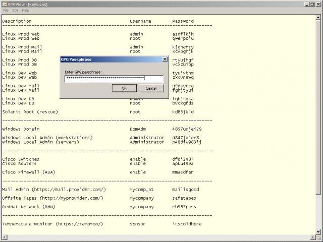GPGView is a front-end for GPG on Windows. It allows easy distribution password files among team members. Encryption should be done with GPG itself (command line), GPGView decrypts and presents the files to recipients.