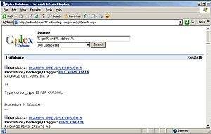 The Gplex Database – GplexDB crawls and indexes all your SQL, Oracle and DB2(beta) databases for Functions, Triggers, Procedures, Tables, Columns, Views, Packages and Procedures and your source code all of which are searchable from a single interface.