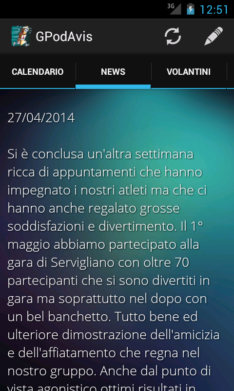 Applicazione per la visione degli appuntamenti agonistici, delle news pubblicate dal gruppo e dei volantini pubblicati dalle varie organizzazioni nell'ambito del running. Consente l'iscrizione per i soci tesserati iscritti alla Fidal, alle competizioni agonistiche e non in base ai calendari regionali.
