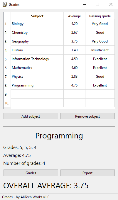 Grades is a powerful and user-friendly cross-platform application designed for managing school grades efficiently. With a sleek and intuitive UI built using the Qt framework, it offers comprehensive features to handle all aspects of grade management. Users can easily add, update, and remove subjects and grades, view detailed reports, and export data as needed. The application ensures smooth operation with customizable options for handling grades and subjects, making it an essential tool for students and educators alike.