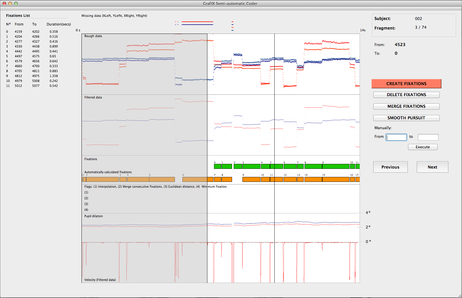 GraFIX is a software and a method to detect fixations in low and high quality data, consisting of a two-step process in which eye-tracking data is initially parsed by using adaptive velocity-based algorithms, before it is hand-coded using the graphical interface, allowing accurate and rapid adjustments of the algorithms' outcome. GraFIX is released under the GPLv3 public license (http://www.gnu.org/licenses/).