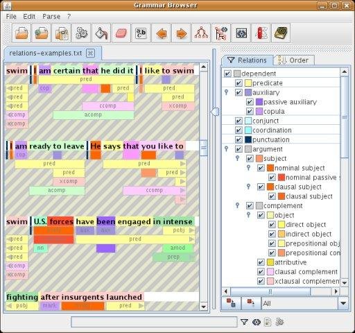 Contains grammatical relation editor to modify, import, export grammatical relation definitions (tregex patterns and features).