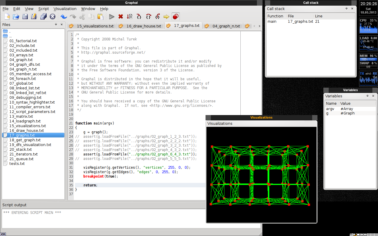 Graphal is an interpreter of a programming language that is mainly oriented to graph algorithms. There is a command line interpreter and a graphical integrated development environment. The IDE contains text editor for programmers, compilation and script output, advanced debugger and visualization window. The progress of the interpreted and debugged graph algorithm can be displayed in 3D scene.