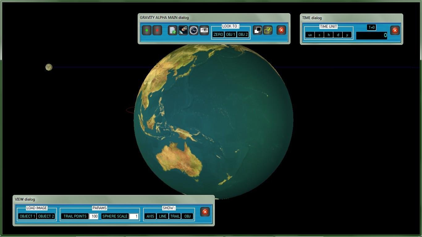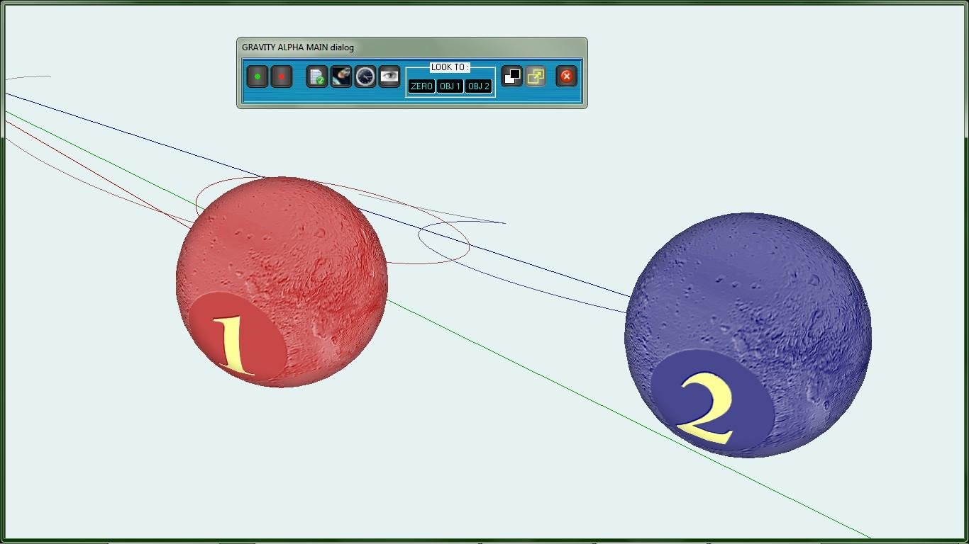 GRAVITY ALPHA is developed for visualization of gravitational force effects between (two) objects.