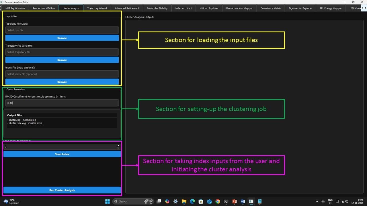 - Conduct cluster analysis effectively (set-up the clustering job, customizable RMSD Cutoffs, index specific cluster analysis etc. Support trajectories from Gromacs and NAMD)