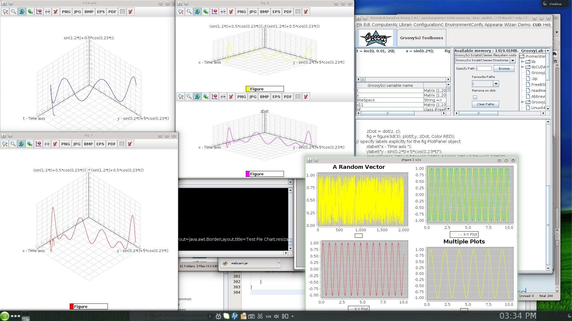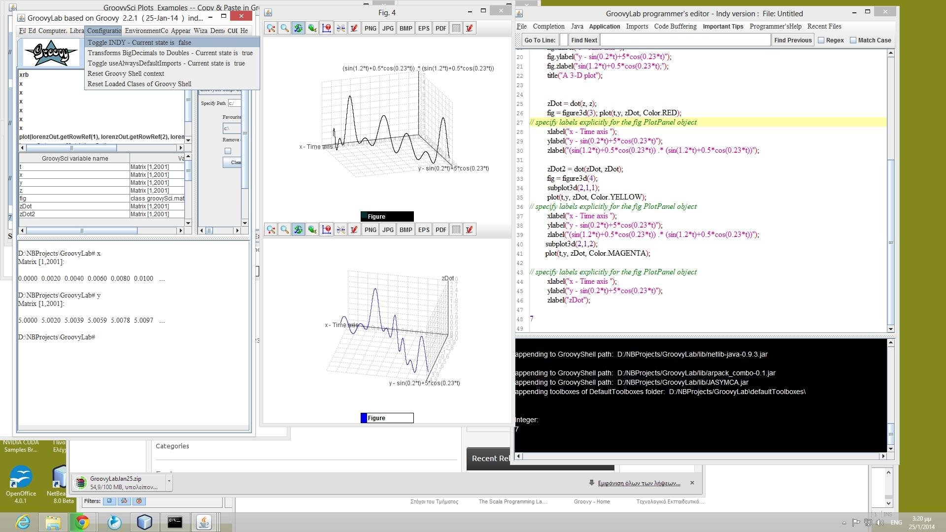 The GroovyLab environment aims to provide a MATLAB/Scilab like scientific computing platform that is supported by a scripting engine implemented in Groovy language. The GroovyLab user can work either with a MATLAB-like command console, or with a flexible editor based on the rsyntaxarea (http://fifesoft.com/rsyntaxtextarea/) component, that offers more convenient code development. GroovyLab supports extensive plotting facilities and can exploit effectively a lot of powerful Java scientific libraries, as JLAPACK , Apache Common Maths , EJML , MTJ , NUMAL translation to Java , Numerical Recipes Java translation , Colt etc. Also, GroovyLab supports Computer Algebra based on the symja (http://code.google.com/p/symja/) project.