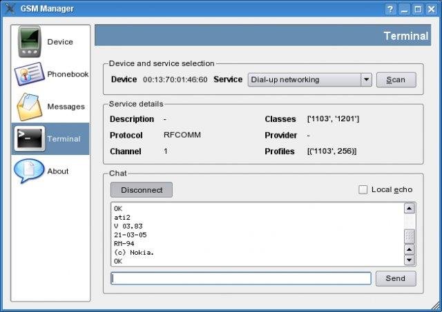 GSM Phone manager with a friendly graphical user interface. It uses QT for GUI, Bluetooth technology for connection and the GSM extended set of AT commands for the dialog with the device.