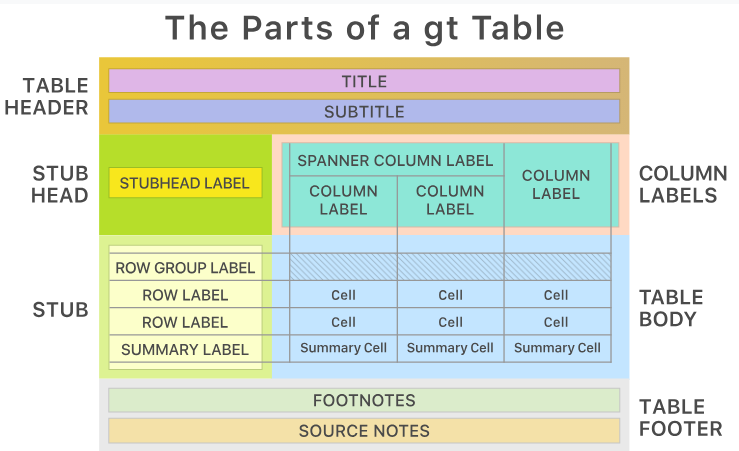 With the gt package, anyone can make wonderful-looking tables using the R programming language. The gt philosophy: we can construct a wide variety of useful tables with a cohesive set of table parts. These include the table header, the stub, the column labels and spanner column labels, the table body, and the table footer. It all begins with table data (be it a tibble or a data frame). You then decide how to compose your gt table with the elements and formatting you need for the task at hand. Finally, the table is rendered by printing it at the console, including it in an R Markdown document, or exporting it to a file using gtsave(). Currently, gt supports the HTML, LaTeX, and RTF output formats.