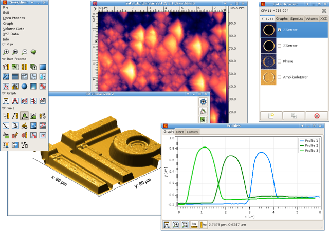 A data visualization and processing tool for scanning probe microscopy (SPM, i.e. AFM, STM, MFM, SNOM/NSOM, ...) and profilometry data, useful also for general image and 2D data analysis.