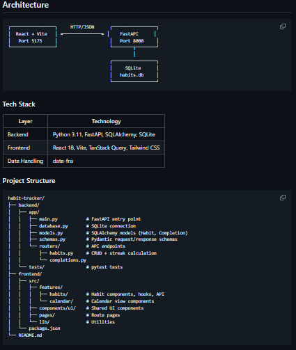 Habit Tracker is a personal habit-tracking web application designed to help users build and maintain daily habits through intuitive UI and analytics that visualize progress over time. It runs locally with a FastAPI backend (Python) and a React frontend, storing all data in a lightweight SQLite database so there’s no need for user accounts or cloud storage, which keeps habit data fully private and self-contained. The app provides streak tracking and completion rates for each habit, giving users feedback on consistency and motivation by showing how often habits are completed and where they may be lagging. A calendar view lets users see a monthly grid of their habit history with color-coded days to highlight patterns and encourage daily engagement. Habit-Tracker also supports planned absences so users can skip days without breaking their streaks, reducing frustration and keeping long-term habits on track.